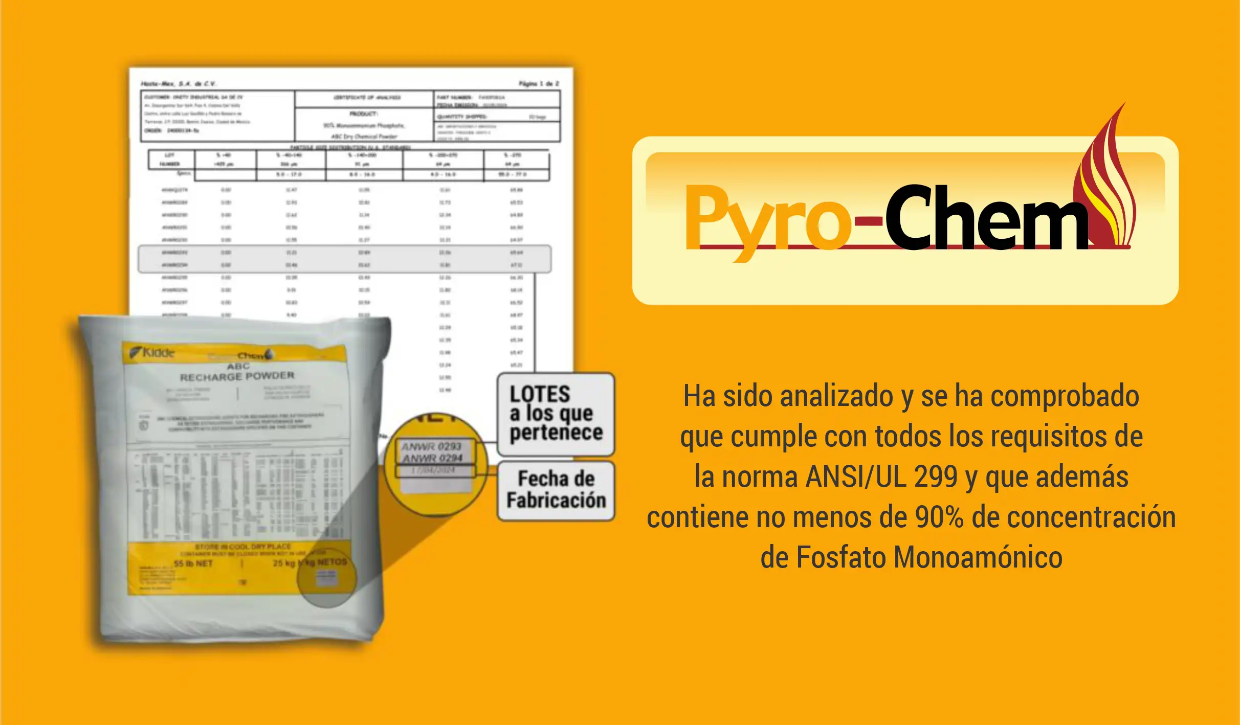 El análisis y Certificado de laboratorio del Agente extintor polvo químico seco Pyro–Chem ABC 90% UL, es para constatar que el Lote que figura en las etiquetas de las bolsas de 25 Kg de Pyro–Chem ABC 90% UL ha sido analizado y se ha comprobado que cumple con todos los requisitos de la norma ANSI/UL 299 y que además contiene no menos de 90% de concentración de Fosfato Monoamónico (MAP por sus siglas en Ingles).